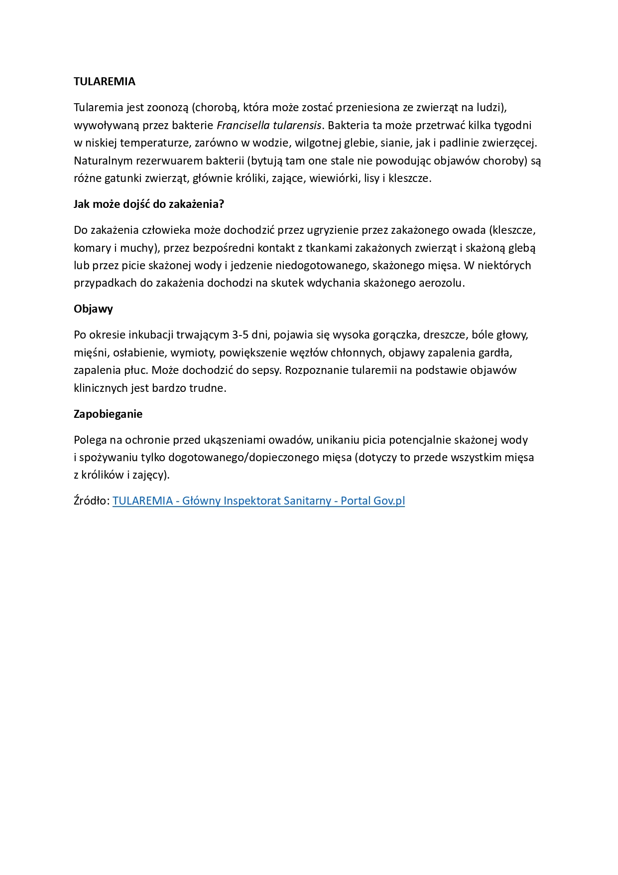 W związku ze stwierdzeniem przypadku tularemii u człowieka, Powiatowy Lekarz Weterynarii w Głogowie przekazuje podstawowe informacje dotyczące tej choroby.