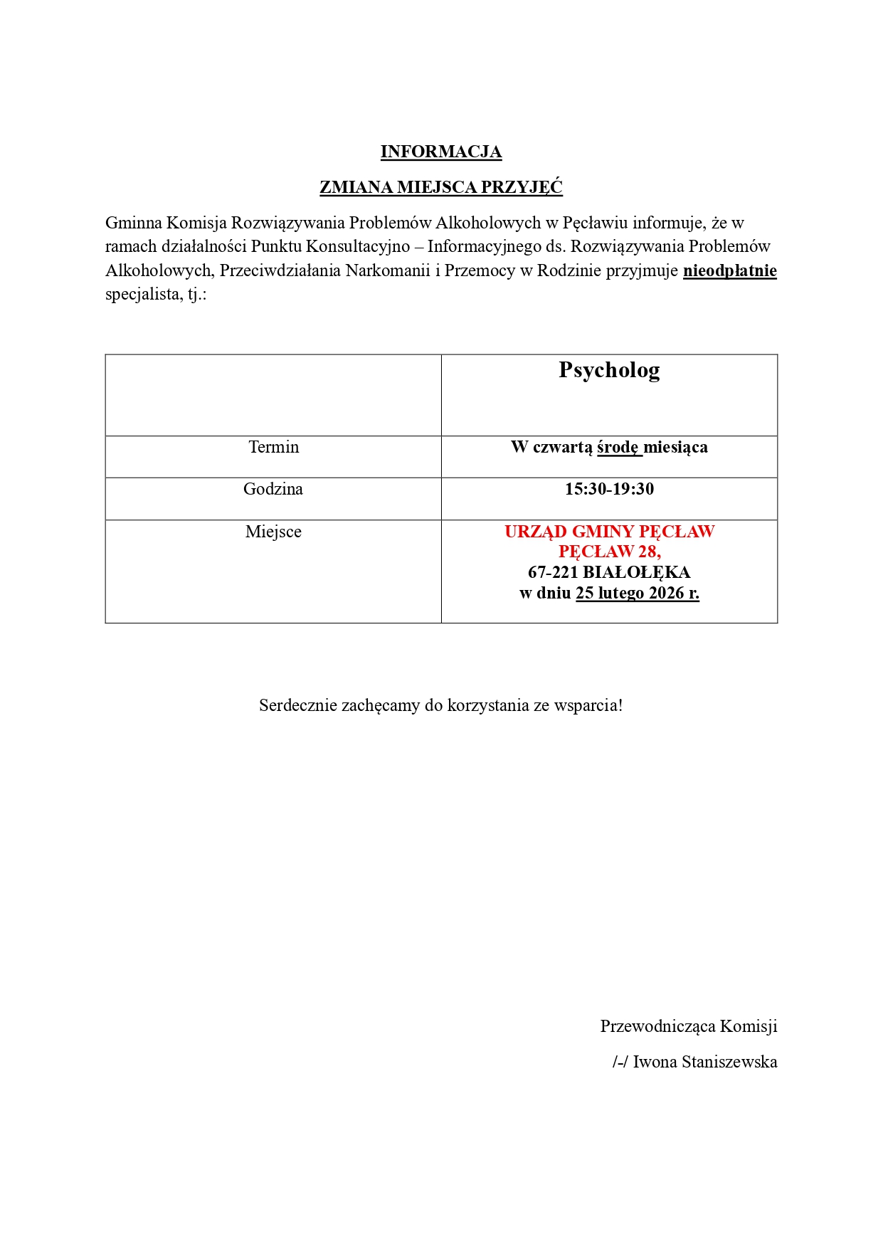 INFORMACJA -Zmiana miejsc przyjęć Gminnej Komisji Rozwiązywania Problemów Alkoholowych