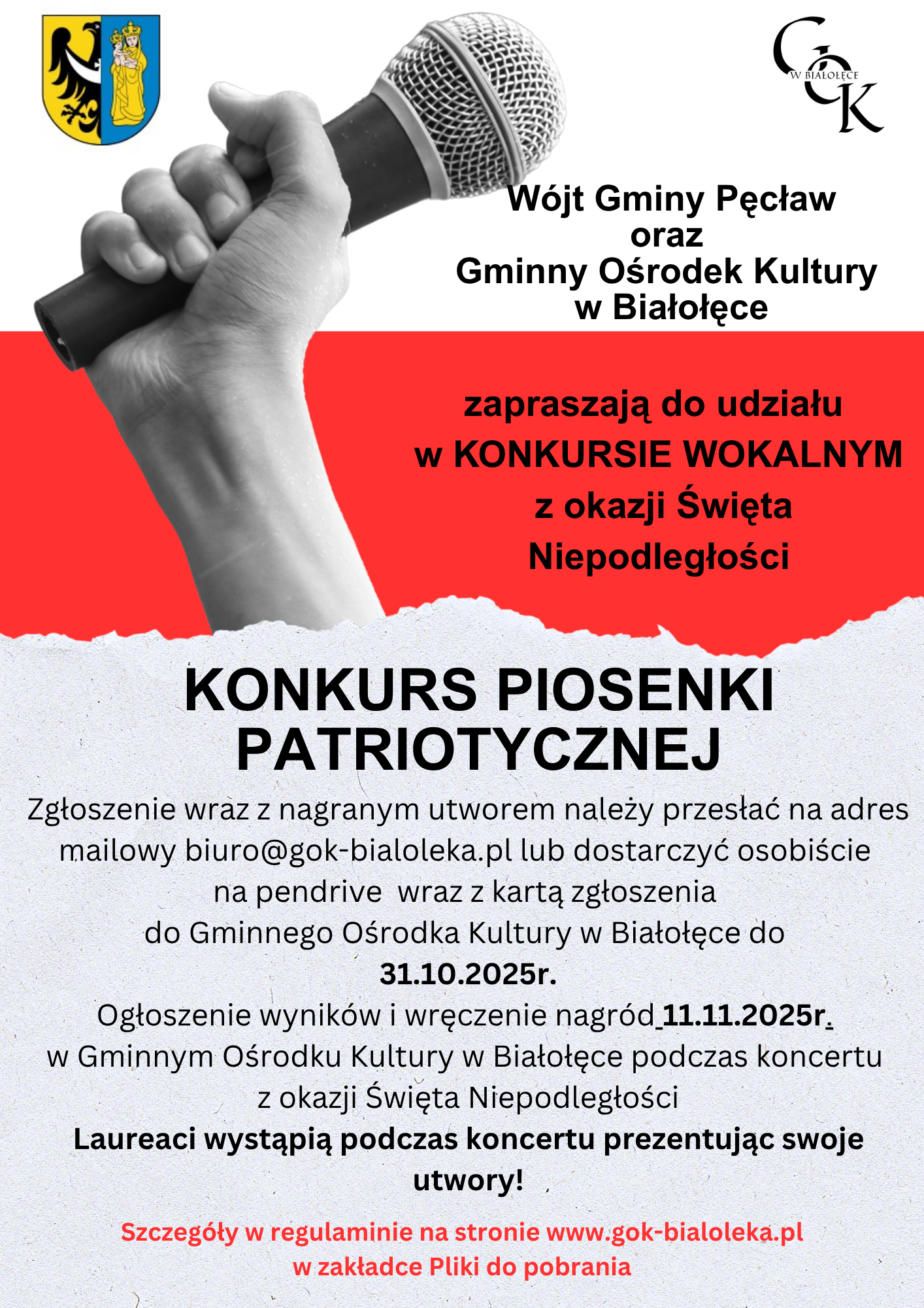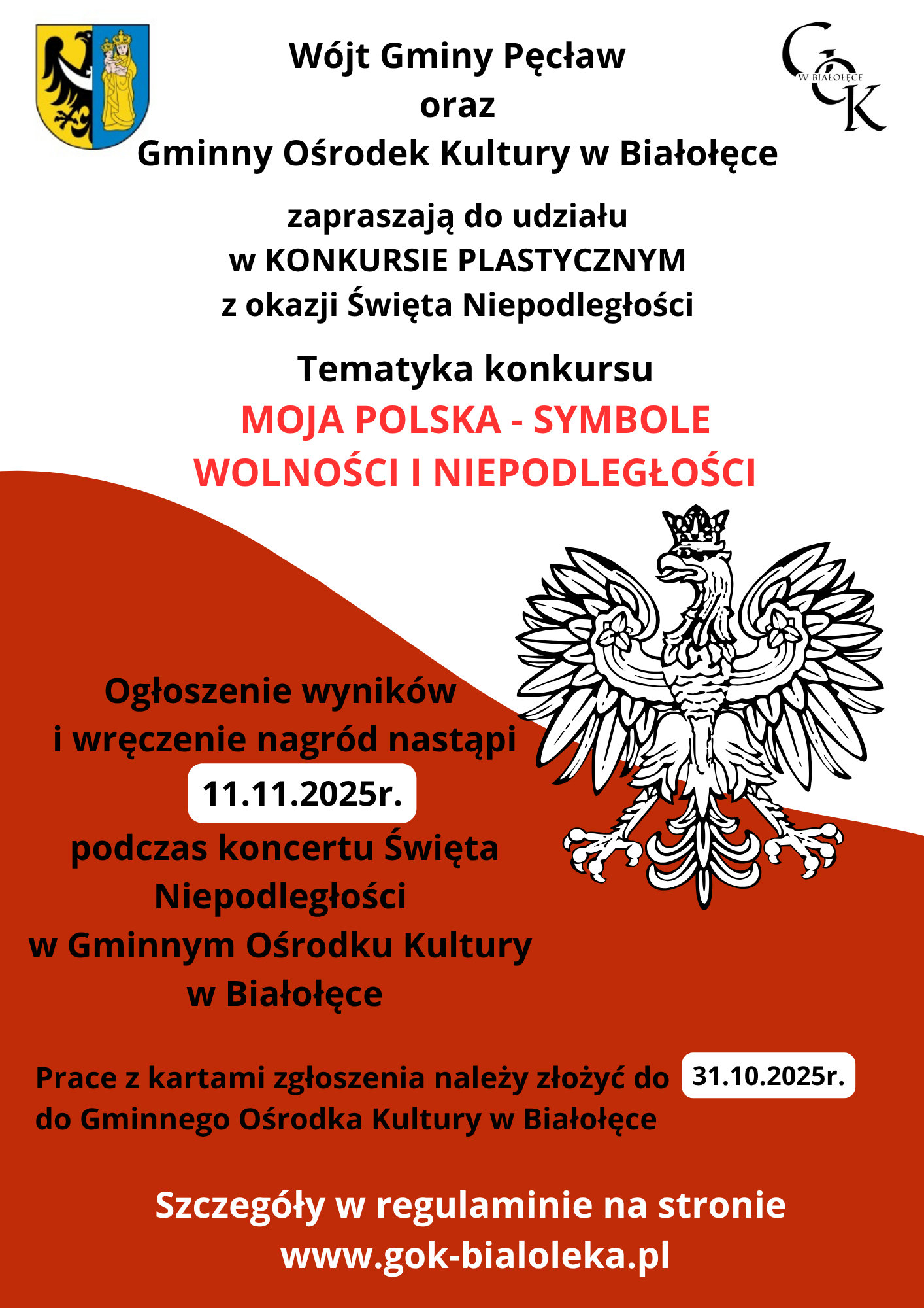 Ogłoszenie wyników i rozdanie nagród odbędzie się podczas koncertu zorganizowanego z okazji Święta Niepodległości, który odbędzie się w Gminnym Ośrodku Kultury w Białołęce dnia 11.11.2025 r.